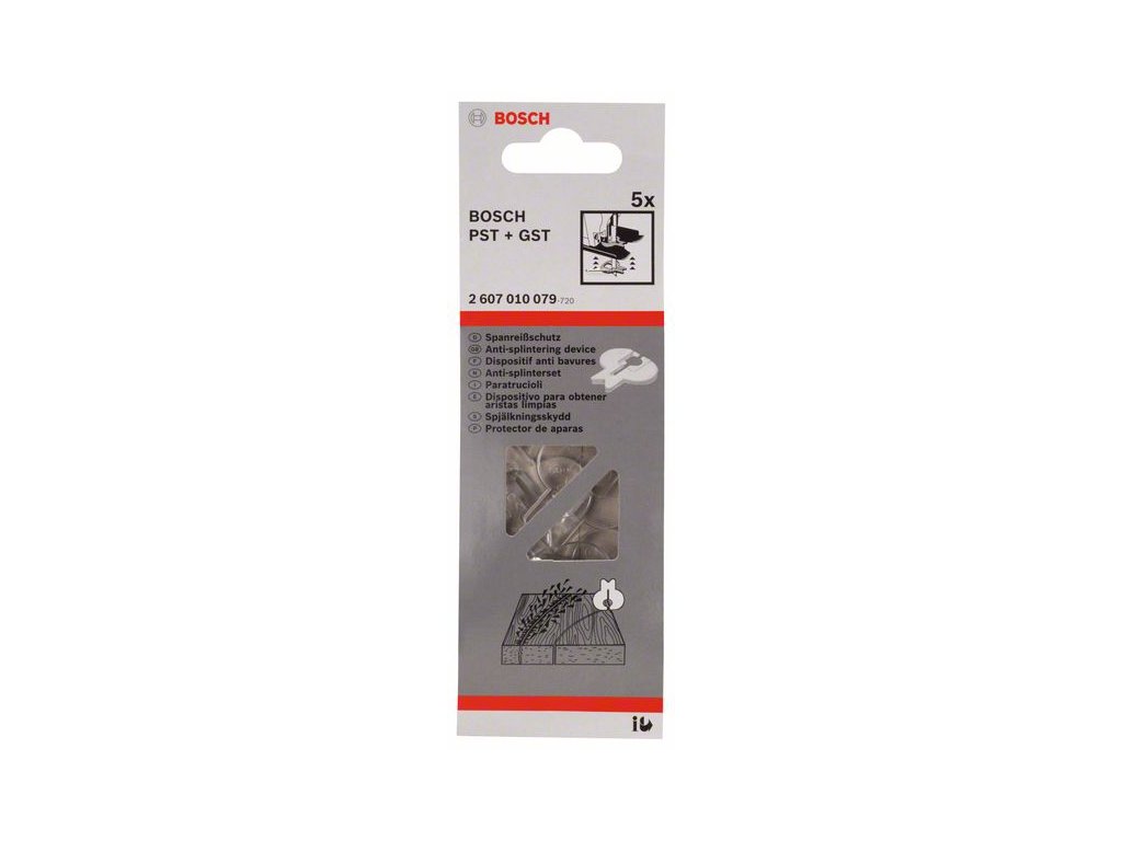 Ochrana proti odštiepeniu zabraňuje vytrhnutiu materiálu z hornej vrstvy. Najúčinnejšia je pri rezaní po vlákne alebo šikmo na vlákno. Hodí sa pre: GST 14.4 V; GST 18 V; GST 75 BE; GST 80 Professional; PST 650; PST 650 L; PST 680 E; PST 680 EL; PST 700 PE; PST 800 PEL; PST 900 PEL; PST 1000 CE.Dodatočné parametre