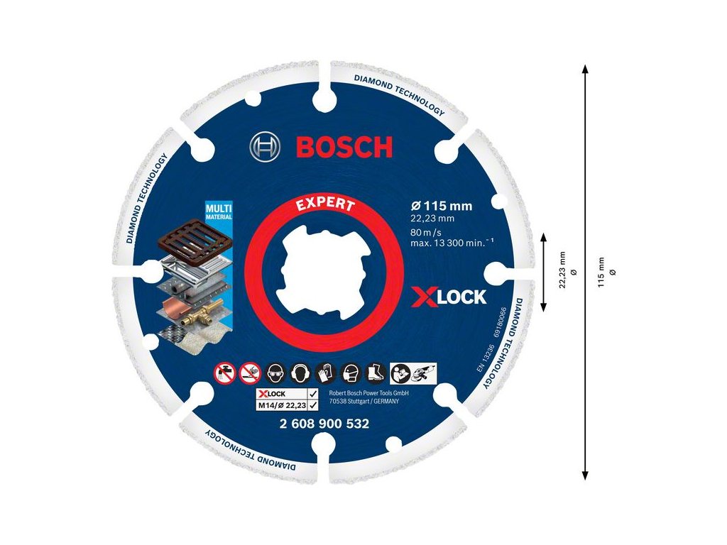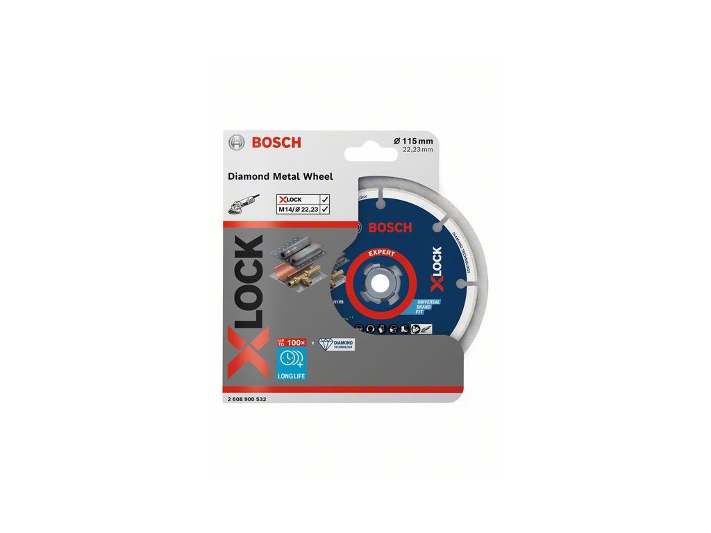 Diamantový kotúč X-LOCK na kov ponúka až 100-krát dlhšiu životnosť pri rezaní kovu. Jeho oceľové telo s diamantovou reznou hranou je extrémne pevné, kotúč si po celú dobu životnosti zachováva konštantnú hĺbku a rýchlosť rezu. Vďaka diamantovej technológii Bosch sa kotúč pri páde na zem neroztriešti a pri rezaní nevytvára chemický zápach ani nezvyšuje prašnosť. Je určený na rezanie kovov vrátane ocele, liatiny, nehrdzavejúcej ocele a medi. Diamantové kotúče na kov Bosch spĺňajú tie najvyššie požiadavky na bezpečnosť, napríklad normu EN 13236. Vďaka bezkľúčovému systému X-LOCK je výmena brúsnych kotúčov rýchla a pohodlná.Priemer mm: