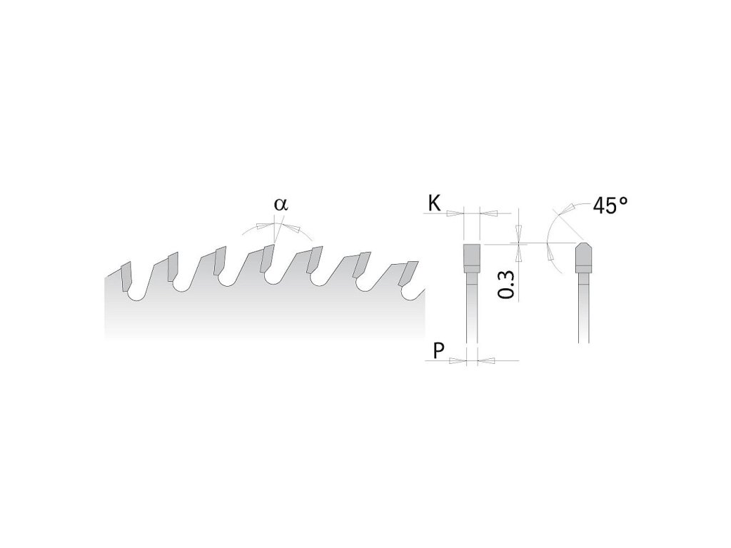 Pílový kotúč pre píly s predrezom. Kotúč s chromovaným povrchom, ktorý redukuje prichytávanie zvyškov lepidla a živice na telo kotúča. Trapézové zuby z extra tvrdého tvrdokovu pre rezanie lamina, drevotrieskových dosiek a MDF. Má tlmiace drážky vyplnené oranžovým polyuretánom pre zníženie vibrácií a hlučnosti. Vysoká životnosť.
