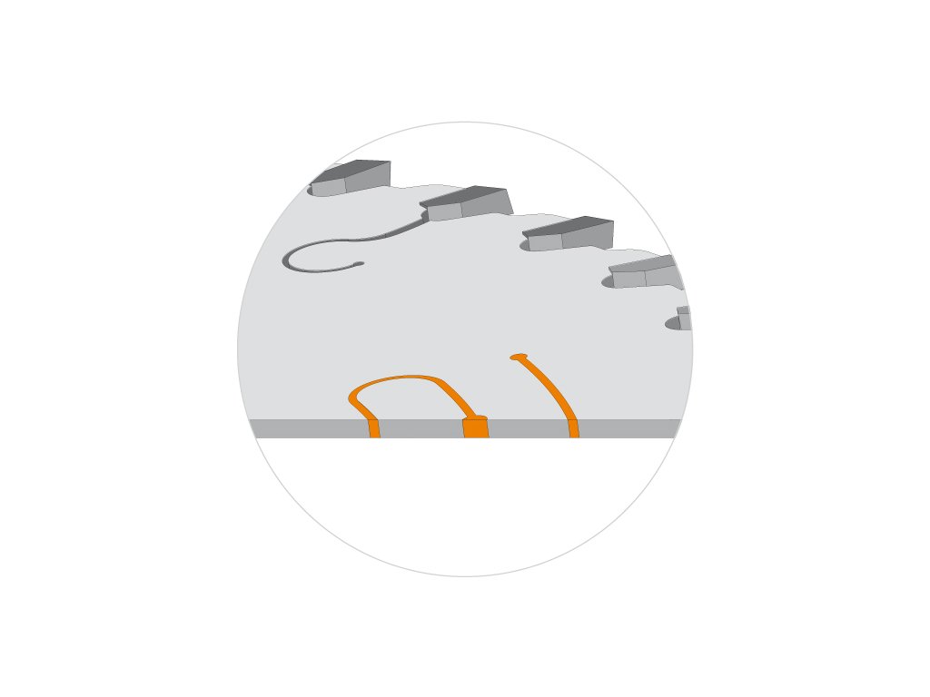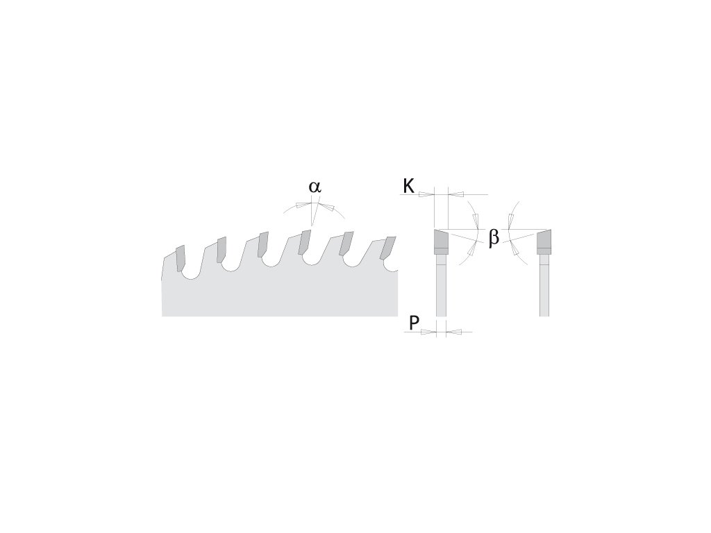 Pílový kotúč s chromovaným povrchom, ktorý redukuje prichytávanie zvyškov lepidla a živice na telo kotúča. Striedavo šikmé zuby z extra tvrdého tvrdokovu pre rezanie mäkkého a tvrdého dreva, preglejky, škárovky atď. Má tlmiace drážky vyplnené oranžovým polyuretánom pre zníženie vibrácií a hlučnosti. Vysoká životnosť.