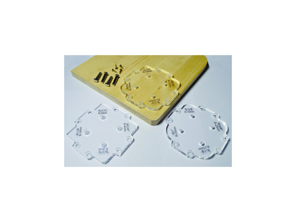 Užitočný trojdielny set šablón obsahuje 8 mm silné akrylové šablóny, ktoré umožňujú vytvárať 12 rôznych polomerov za pomoci orezávacej alebo drážkovacej frézy. Sada obsahuje 4 nastavovacie kolíky a 4 skrutky. Kolíky použite pre umiestnenie šablóny na obrobku, ďalej použite štyri skrutky pre jej upevnenie. Vyberte nastavovacie kolíky a použite stopkovú frézu pre odfrézovanie rohu obrobku podľa šablóny.