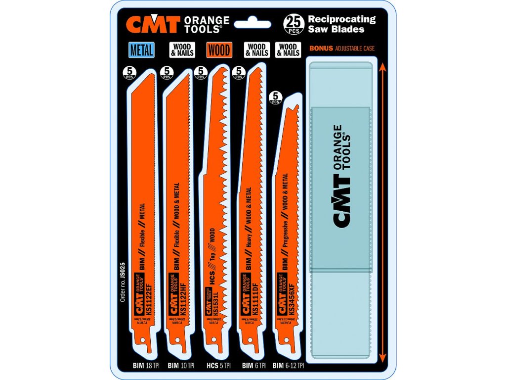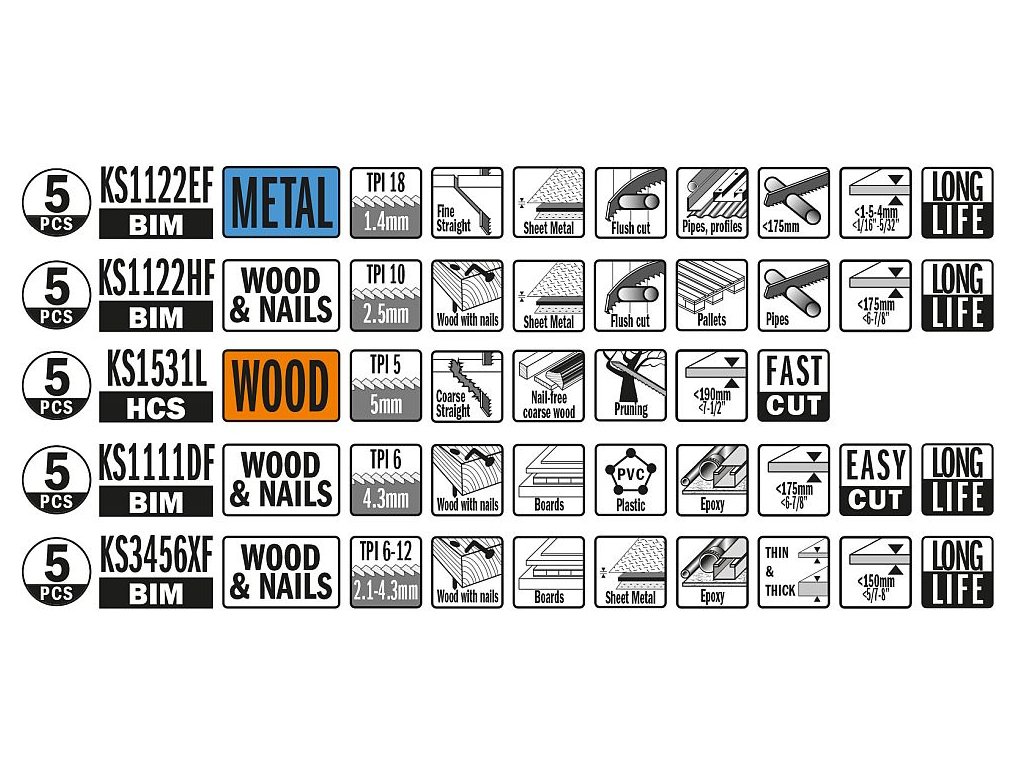 Sada 25 kusov obsahuje 5 najpopulárnejších pílových listov pre chvostové píly. Sada je zložená z pílových listov vhodných pre rôzne materiály: