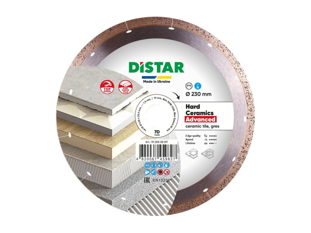 Diamantový kotúč HARD CERAMICS ADVANCED s hrúbkou 1,3mm je určený na rýchle rezanie porcelánových gresov a tvrdej keramiky. Porcelánové gresy s hrúbkou viac ako 20 mm sú čoraz populárnejšie, pretože výrobné spoločnosti neustále pracujú na zvyšovaní ich hrúbky, ako aj odolnosti proti opotrebovaniu a mrazu. Nie každý diamantový kotúč je schopný rezať takéto materiály.
