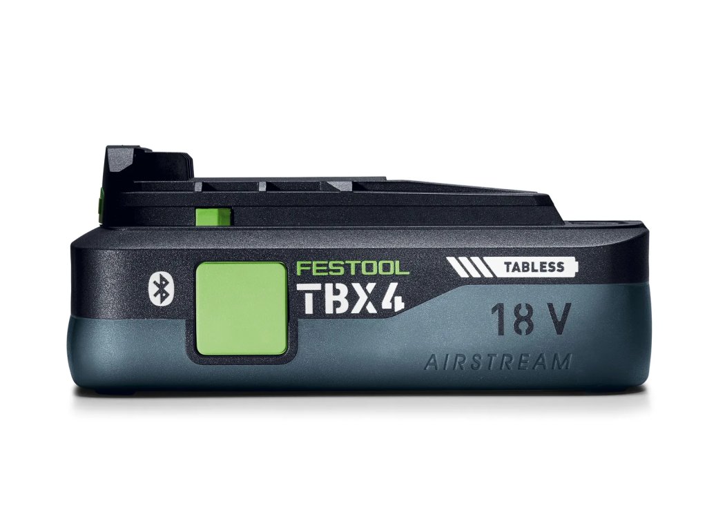 Výkonný akumulátor TBX 4 s technológiou Tabless je ideálnym partnerom pre náročné aplikácie – s nízkou hmotnosťou a zároveň dobrou manipuláciou. Umožňujú to články s technológiou Tabless: nižšia tvorba tepla, dlhšia doba chodu a rýchlejšie nabíjanie. Vďaka technológii AIRSTREAM sa akumulátor s rýchlonabíjačkou AIRSTREAM SCA 16 aktívne chladí pred a počas nabíjania a je extrémne rýchlo opäť pripravený na použitie. Optimalizovaný tok energie akumulátorov s technológiou Tabless vám poskytne extra porciu výkonu a zabezpečí dlhšiu životnosť vášho akumulátora. Akumulátor, ktorý je vybavený technológiou Bluetooth®, automaticky spustí spárovaný vysávač po zapnutí akumulátorového náradia – a v kombinácii s aplikáciou Festool poskytuje podrobné informácie o stave nabitia, teplote alebo nabíjacích cykloch. A, samozrejme, je plne krytý 3-ročnou zárukou Festool Service.