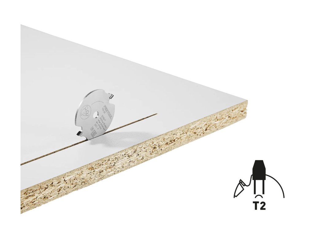 Diamantový predrezávací pílový kotúč predreže vrchnú vrstvu materiálu, a tým zabezpečí rez bez ostrapov na obidvoch stranách. Vynikajúci na poťahované alebo dyhované drevotrieskové dosky. Vďaka dvom diamantovým zubom sa aj pri ťažko opracovávateľných materiáloch podaria rezy bez ostrapov.