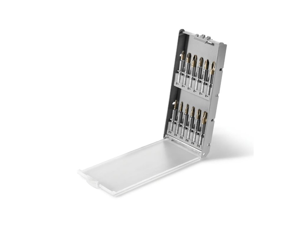 V praktickej kazete s priehradkami vo veku je vždy čisto uložených 12 vysokokvalitných 50 mm skrutkovacích hrotov CENTROTEC, ktoré sú tak vždy rýchlo poruke. Kazetu so skrutkovacími hrotmi možno používať ako Systainer s priehradkou vo veku alebo ako samostatný box. Vďaka zabudovaným magnetom skrutkovacie hroty bezpečne držia na svojom mieste a možno ich pohodlne vybrať i odložiť. Skrutkovacie hroty sa dajú zasunúť priamo do skľučovadla na nástroje CENTROTEC a výrazne znížiť celkovú dĺžku, pretože nie je potrebný držiak hrotov.