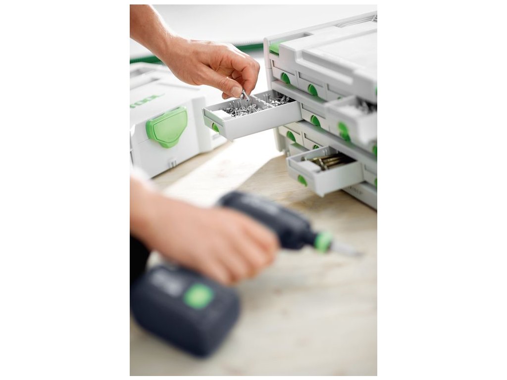 Pre zmenu sú tu zásuvky: Aby ste mali malé diely ako klince, rozperné kolíky alebo skrutky usporiadané rovnako prehľadne ako svoje ručné náradie. Tak prestavuje SORTAINER až s 12 zásuvkami ideálny doplnok k programu Systainer.Inteligentný doplnok Systainera.