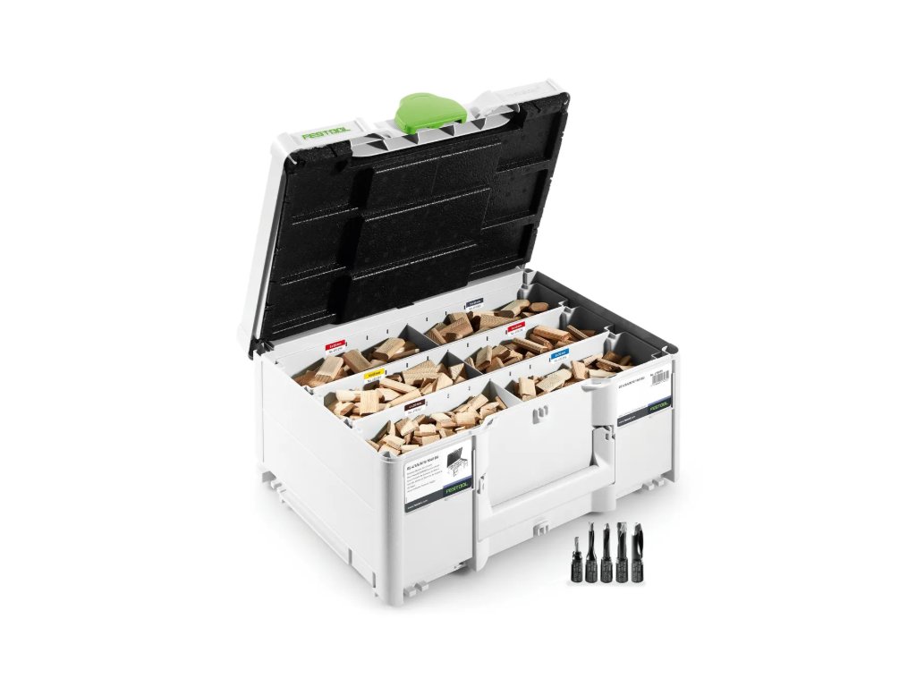 kolíky DOMINO 4 × 20, 5 × 30, 6 × 40, 8 × 40, 8 × 50, 10 × 50 mm, fréza DOMINO pre veľkosti 4, 5, 6, 8 a 10, Systainer SYS3 M 187, v kartónovom obale