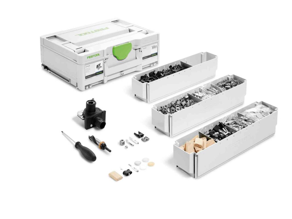 Korpusová spojka DOMINO/DOMINO KV D8, Korpusová spojka DOMINO/LR32 KV-LR32 D8, Spojky stredných strán DOMINO/DOMINO MSV D8, Spojky stredných strán DOMINO/LR32 MSV-LR32 D8, 50 krytiek tmavohnedých KV-AK D15 brn, 50 krytiek strieborných KV-AK D15 slr, 50 krytiek bielych KV-AK D15 wht, 50 krytiek sivých KV-AK D15 gr, DOMINO D 8 x 36 mm, Vŕtacia šablóna BS-KV D15, Vrták na kovanie KVB-HW D15 CE, Skrutkovač, Systainer SYS3 M 137, v kartónovom obale