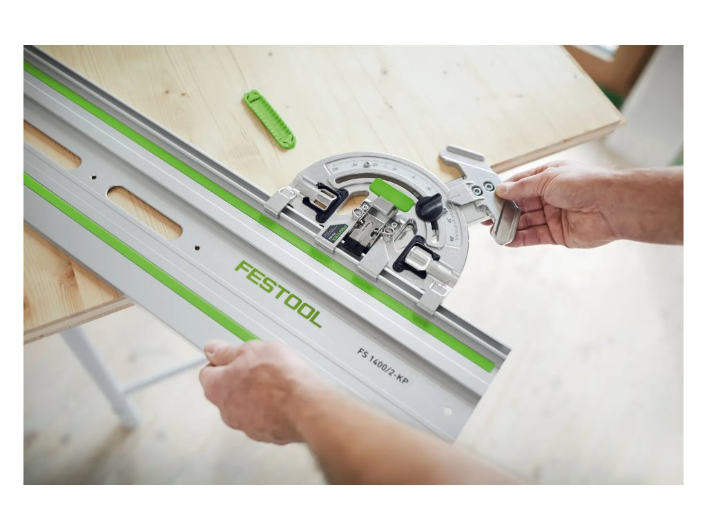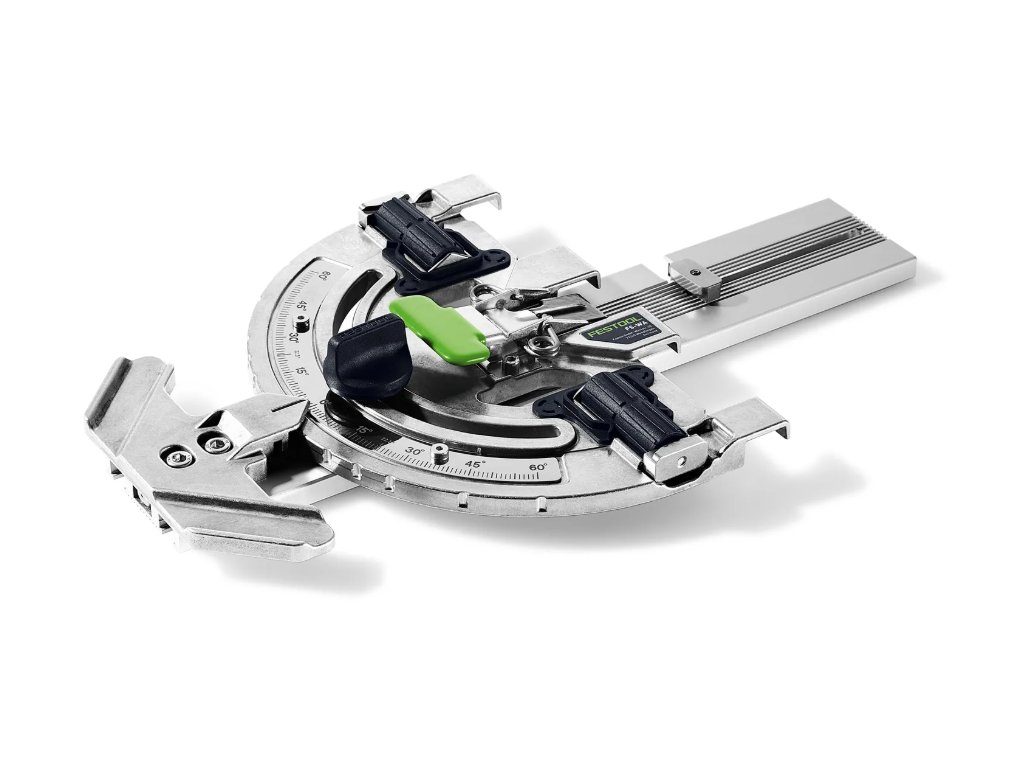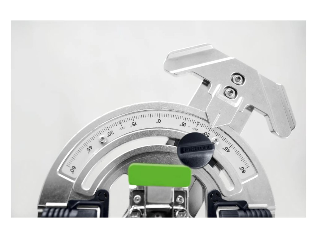 Uhlový doraz pre vodiace lišty – na presné a rýchle šikmé uhlové rezy. Uhly v rozsahu −60° až +60° sa dajú nastaviť s vysokou presnosťou a možnosťou presného opakovania. Uhlový doraz tak poskytuje veľký rozsah použitia a maximálnu flexibilitu. Vďaka rýchloupínacej páke je uhlový doraz intuitívne a obratom ruky umiestnený na vodiacej lište a v kombinácii s ručnou okružnou pílou a rezacím a pracovným stolom sa premení na mobilnú veľkoplošnú pílu. Systém skoncipovaný na docielenie presných, vedených šikmých uhlových rezov.