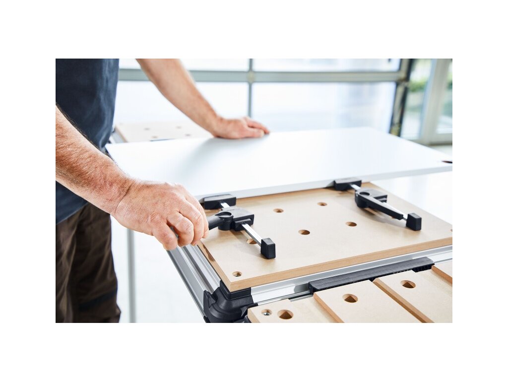 Upínacie prvky MFT-SP umožňujú bezpečné držanie oblých a hranatých obrobkov bez toho, aby skĺzli. Vďaka svojej kompatibilite s perforáciou MFT sa dá ľahko upevniť na multifunkčný stôl alebo mobilnú dielňu.