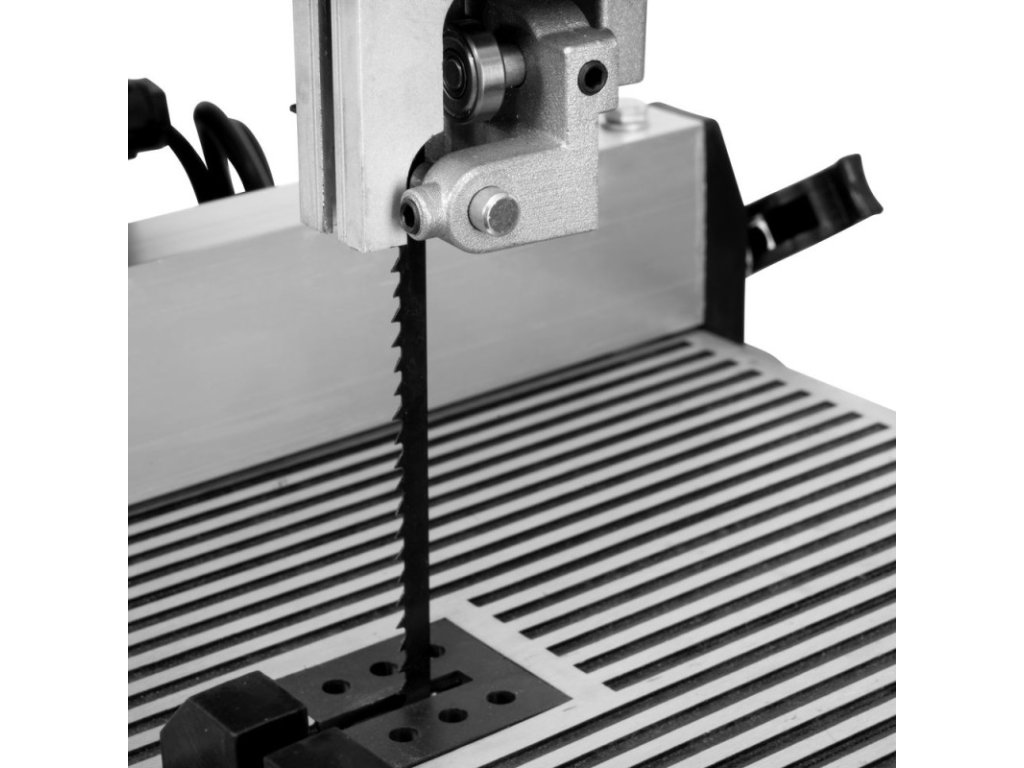 Pásová píla je presná, s nízkymi vibráciami a perfektná pre jemné práce s drevom. Kovové puzdro, hliníkové kladky pílového pásu. Hliníkový stôl výkyvný do 45°, pevný stojan s otvormi pre montáž na stôl, kovový kryt. Spínač nulového napätia, pozdĺžny a pokosový doraz. Prípojka pre odsávací systém s priemerom 49/75/100 mm.