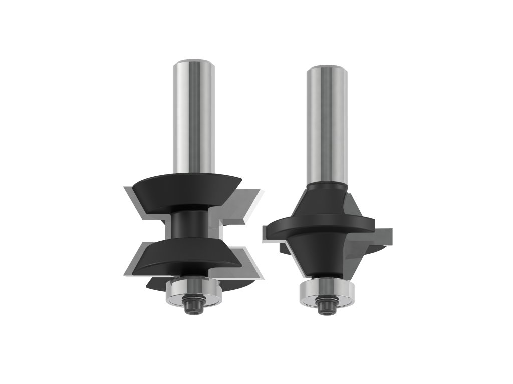 Táto sada je určená pre vyrobenie atraktívnej okrasnej hrany na nábytkových dverách. Použite dosku z MDF alebo preglejky až do hrúbky 25,4 mm a vyrobte k nej krásnu drevenú hranu. Jednoducho nastavte (vycentrujte) každú frézu na stred dosky a vykonajte rez na doske a na hrane. Prilepte hranu na dosku a pokiaľ je nutné zarovnajte orezávacou frézou. Spoj je tvorený perom a drážkou a 60° sklonom profilu tak, aby zabezpečoval maximálnu plochu pre lepidlo a spoj bol dostatočne pevný.