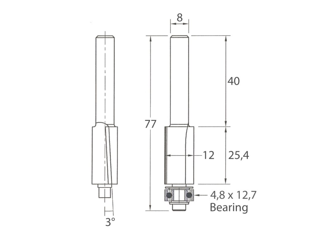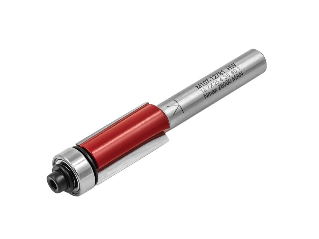 Orezávacia fréza M107 s dvoma šikmými zubami z tvrdokovu a kopírovacím ložiskom je určená pre orezávanie pozdĺž šablóny upevnenej pod obrábaným materiálom, najmä pre frézovanie zakrivených tvarov. Je možné použiť iba v ručných frézkach.