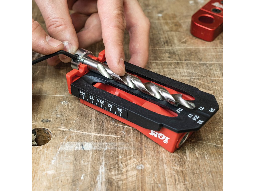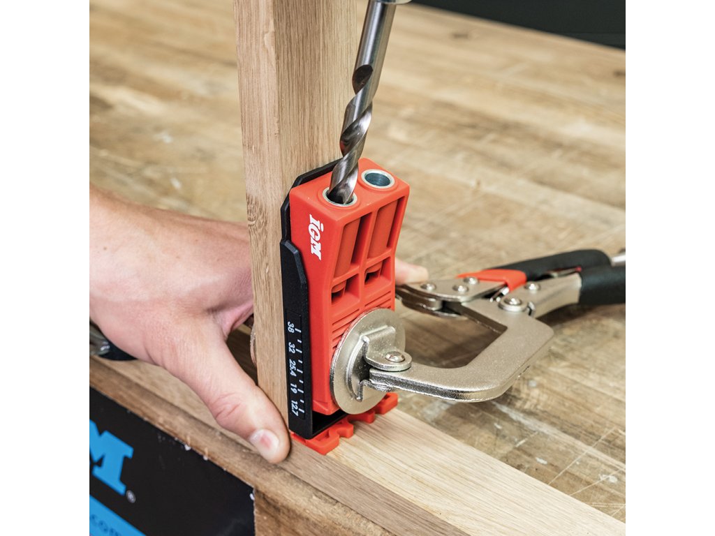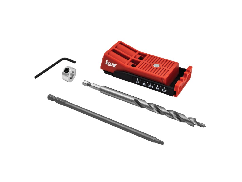 Zvŕtavací prípravok IGM pomôže vytvoriť pevný spoj drevených dielcov, napríklad pri montáži skriniek alebo iného nábytku. Prípravok slúži na vŕtanie otvorov pre skryté skrutkované spoje, s použitím vŕtačky ich vyvŕtate ľahko a rýchlo. Vŕtacie puzdro z tvrdenej ocele vedie HSS vrták s priemerom 9,5 mm do materiálu s hrúbkou 12 – 40 mm. Vďaka dvom puzdrám môžete vytvoriť ešte pevnejší spoj bez zbytočného presúvania. Pomocou stupnice zo spodu prípravku si ľahko nastavíte doraz, stačí len zmerať hrúbku materiálu. Vŕtacie puzdro potom posuniete podľa nameranej hrúbky. Puzdro drží pevne na mieste vďaka magnetu a zárezom v tele prípravku. Štvorhranným bitom Robertson č. 2 zaskrutkujete do vyvŕtaného otvoru Pocket Hole skrutky. Otočnú zarážku využijete pri vŕtaní o hranu dielca alebo pri spevňovaní už spojeného materiálu, napríklad pokosového spoja. Aby ste prípravok pri fixácii na dielec nemuseli zložito pridržiavať, je plochá horná časť vybavená magnetom, ku ktorému sa prichytí čeľusť Pocket Hole svorky.