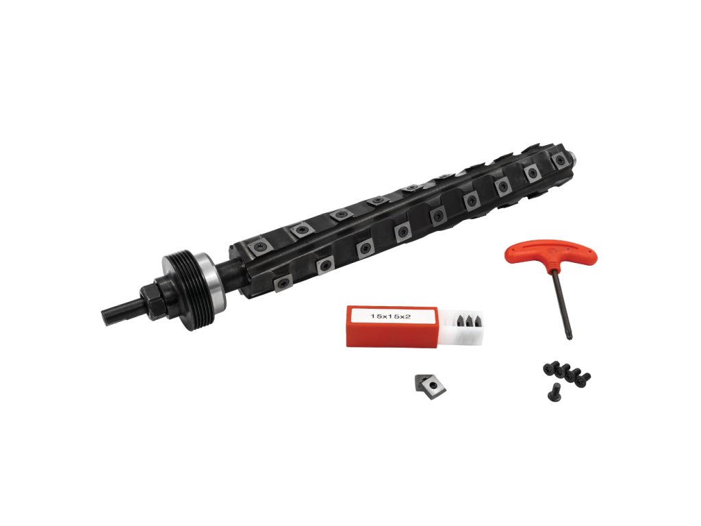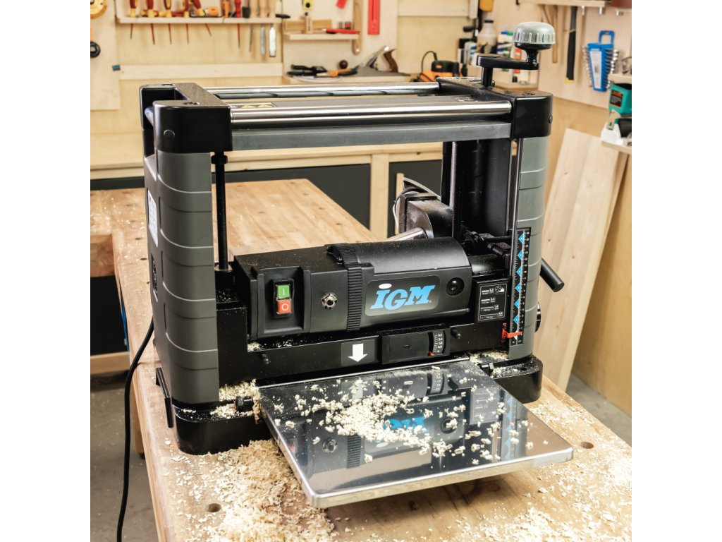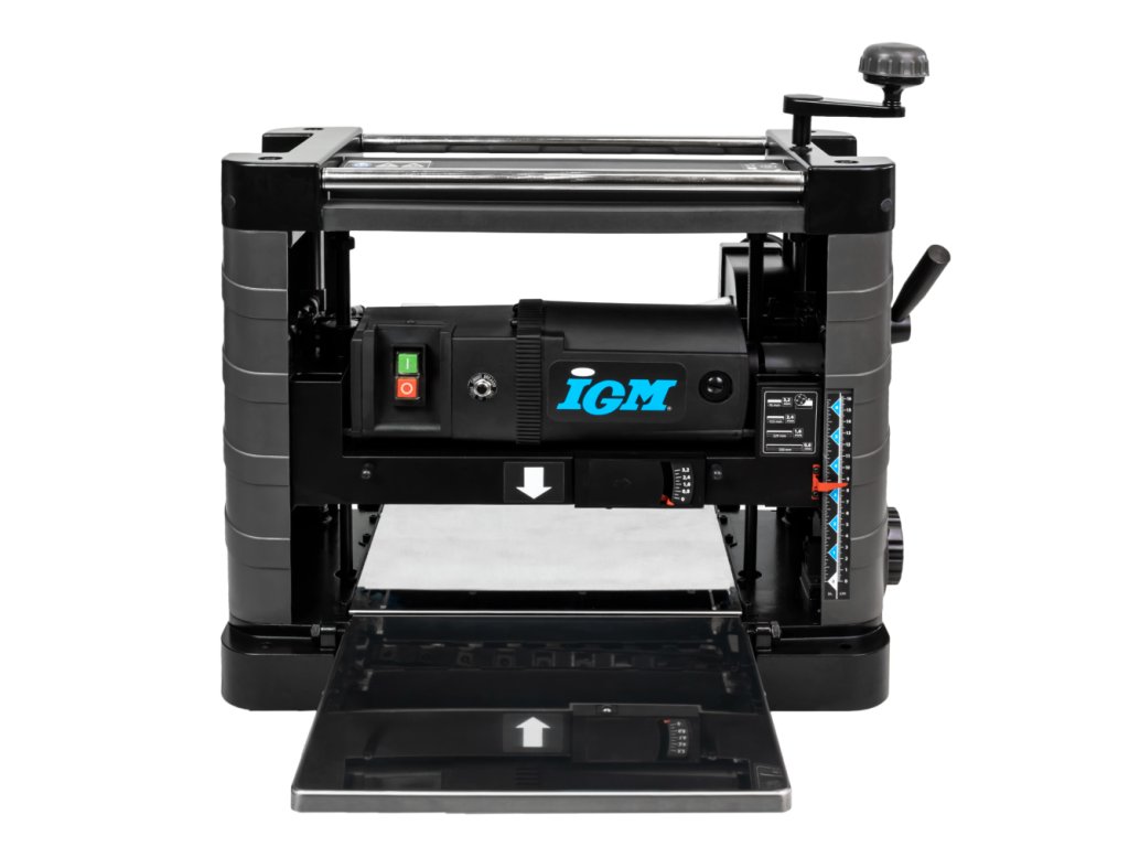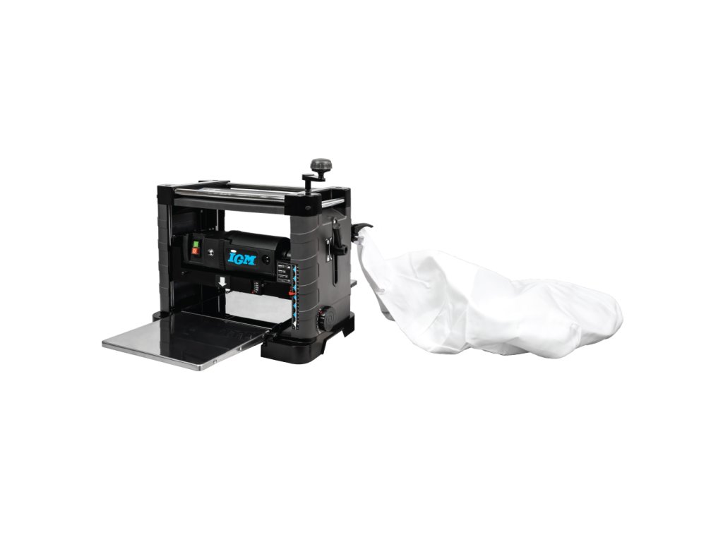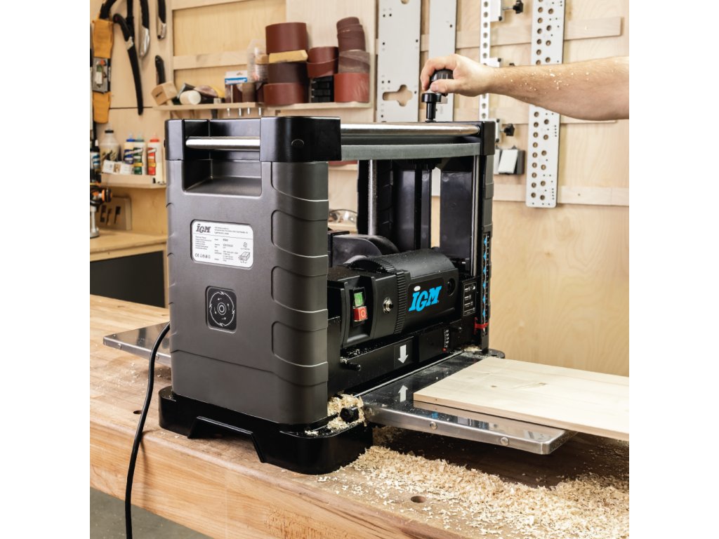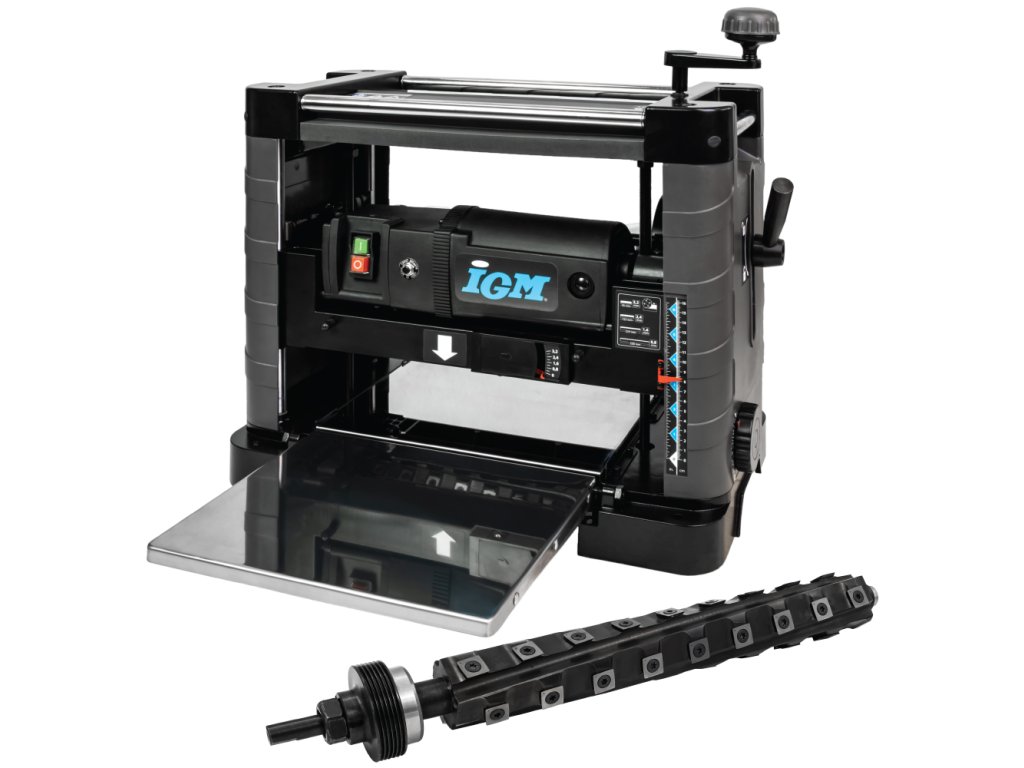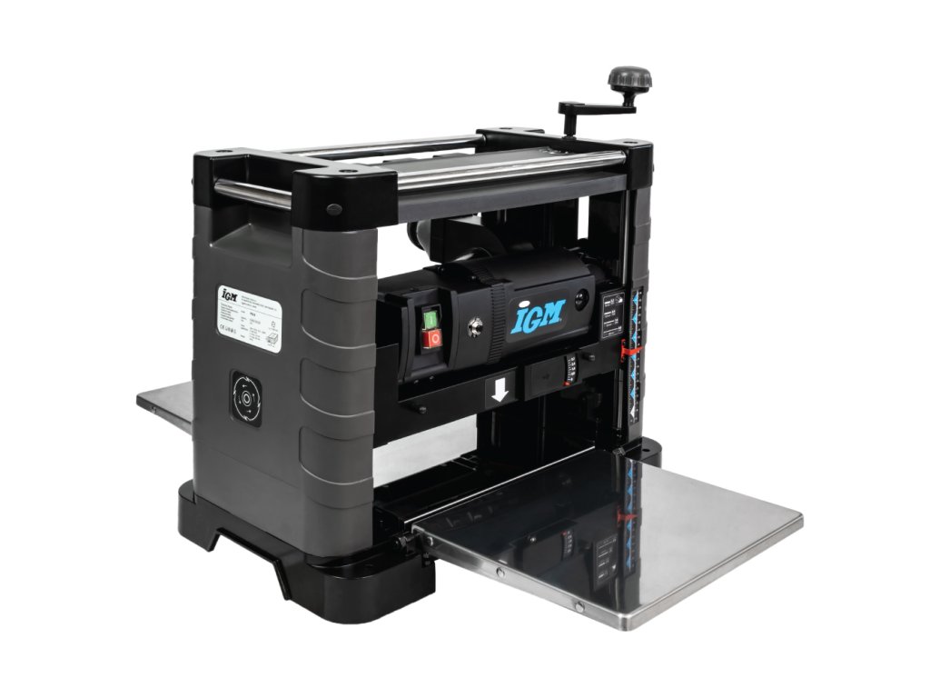 Prvá stolná hrúbkovačka so špirálovým valcom s tvrdokovovými žiletkami na európskom trhu. Presne opracovaná špirálová hobľovacia hlava s 36 tvrdokovovými žiletekami osadenými v 4 špirálach pre maximálnu čistotu a efektivitu opracovania. Špirálová hlava ľahko a veľmi čisto hobľuje aj veľmi tvrdé a exotické drevá, drevo priečnym smerom, nevyštiepava hrče a hobľovaný povrch je za všetkých podmienok oveľa hladší ako po opracovaní bežnými nožmi. Tvrdokovové žiletky majú niekoľkonásobne vyššiu výdrž oproti klasickému hobľovaciemu HSS nožu. Je ich možné 4x otočiť pre ešte dlhšiu životnosť bez výmeny, zdĺhavého čakania na prebrúsenie, alebo nutnosti nastavovania vo valci. Stroj je možné používať aj bez odsávača pilín, vďaka integrovanému ventilátoru a prachovému vrecku, ktoré slúžia pre efektívny odvod pilín od valca. Samozrejme je možné pripojiť aj priemyselný vysávač, alebo odsávač pilín a prachu. Pre maximálnu presnosť je výška hrúbkovania aretovateľná. Pre maximálnu bezpečnosť pri práci je stroj vybavený pogumovanými podávacími valcami, ktoré pevne držia a posúvajú obrobok a oceľové háky pred valcom zabraňujú možnosti spätnému rázu. Výkonný motor je vybavený ochranou voči preťaženiu a voči opätovnému spusteniu pri výpadku elektrického prúdu.