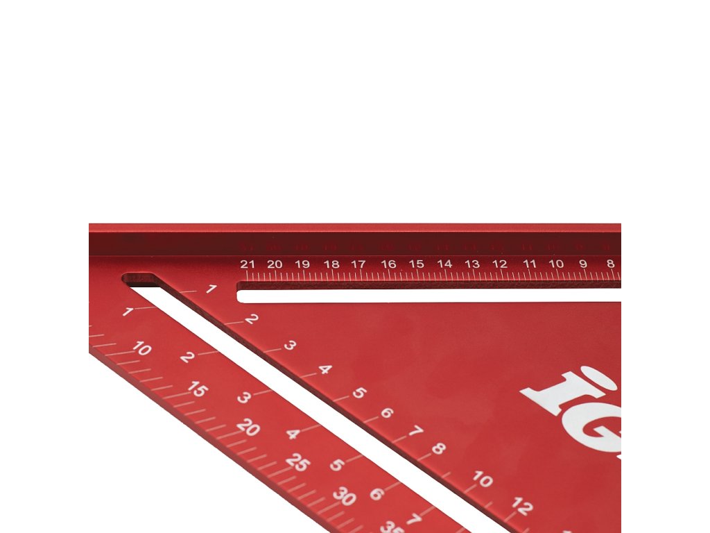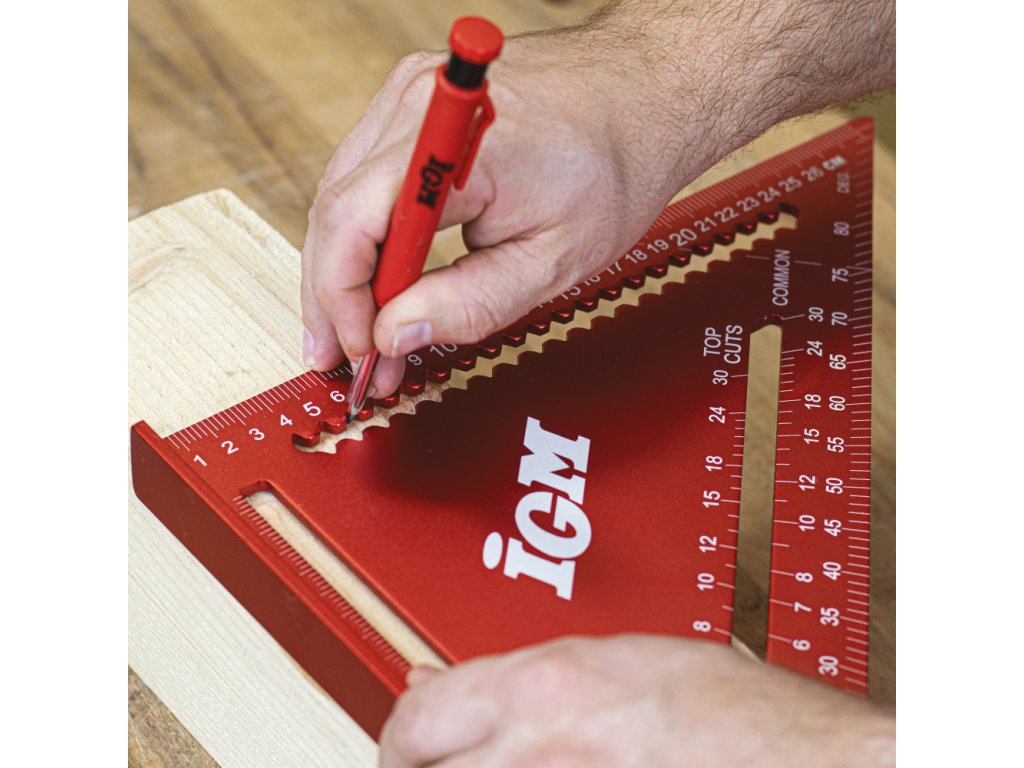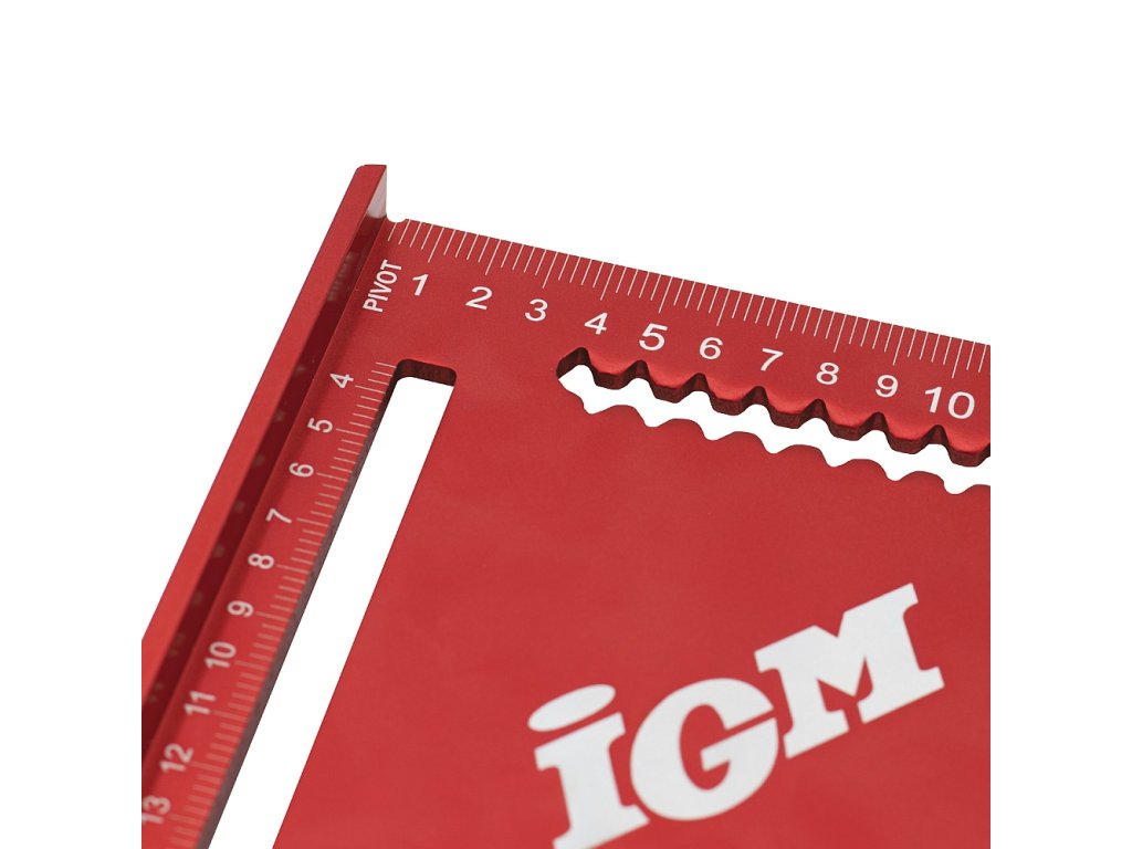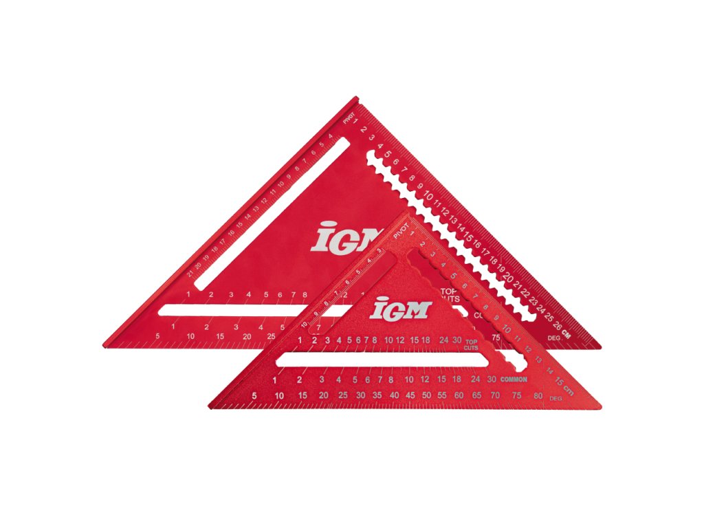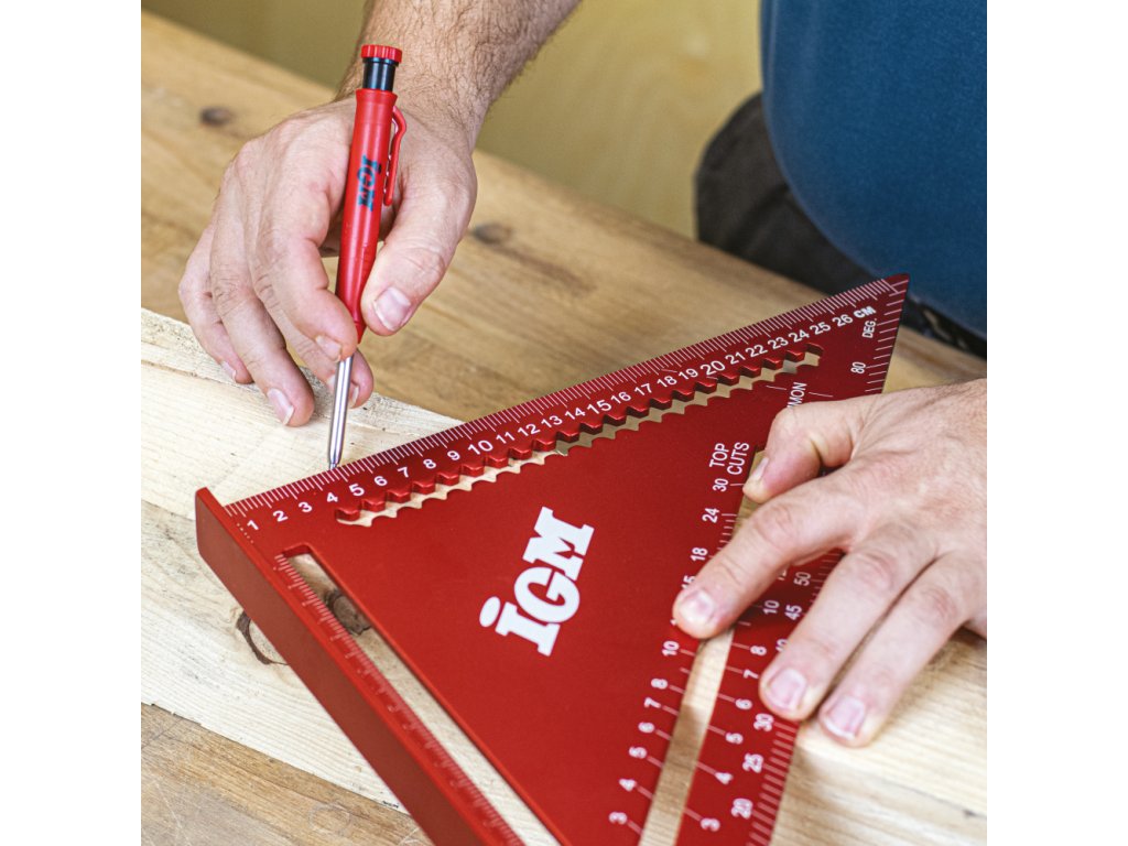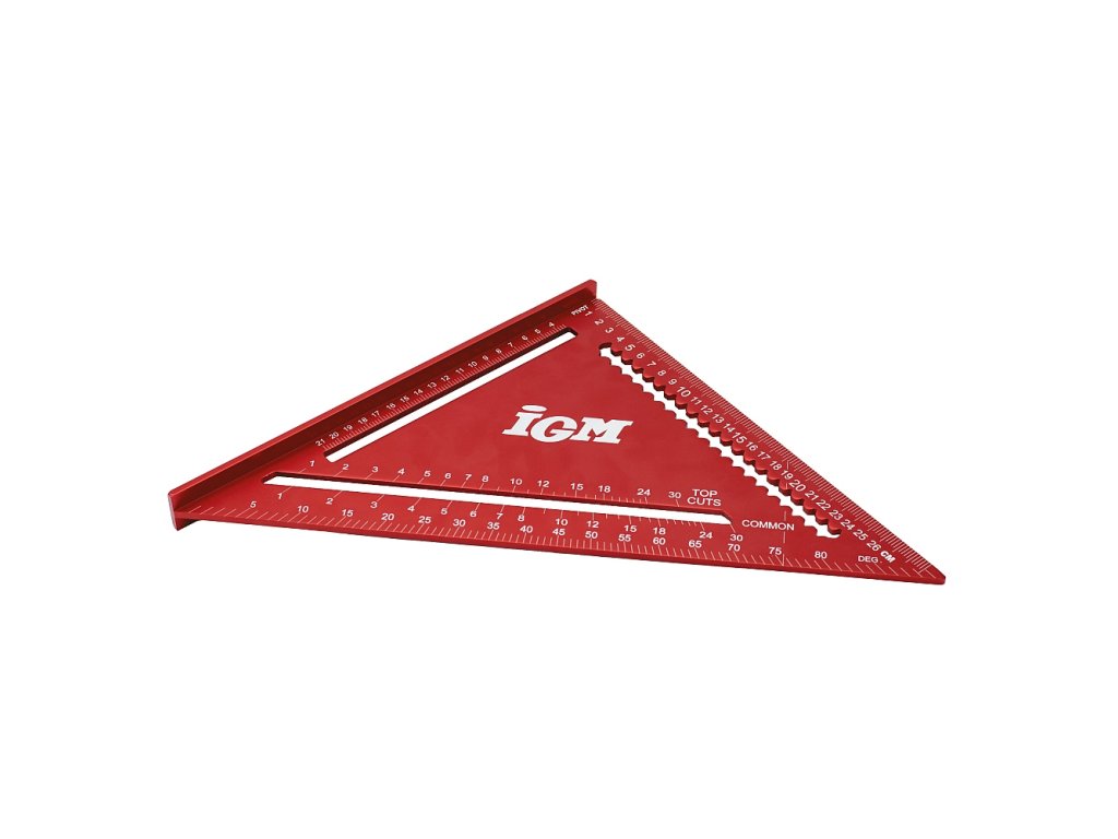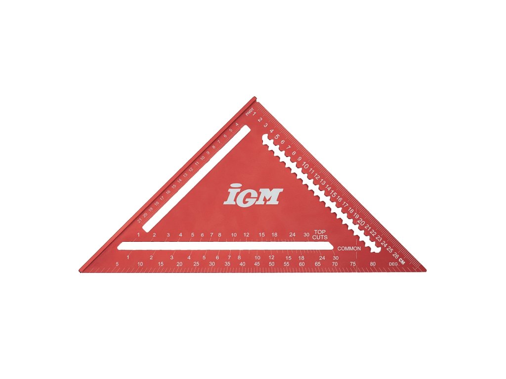 Presný duralový IGM Tesársky uholník je nutnosťou pre každého tesára. Robustný uholník má ľahko čitateľné, laserom vyznačené stupnice na oboch stranách. Kolmá strana je dlhá 180 / 300 mm so zárezmi po 5 mm, čo umožňuje rýchle pozdĺžne rysovanie rovnobežných čiar. Prepona má stupnicu od 0° do 90° a stupnicu pre tvorbu bežných krokiev, nárožných a úžľabných trámov. Je ideálny pre rýchle rysovanie čiar alebo ako vodidlo píly. Výrazne zjednodušuje stavbu strešnej konštrukcie.