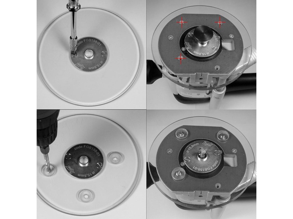 Do niektorých typov horných frézok nie je možné priamo upnúť kopírovací krúžok. Pokiaľ je frézovacia doska pripevnená k základni frézky, umožňuje upnutie našich kopírovacích krúžkov pre všetky typy frézok. Krúžky využijete pre cinkovacie prípravky FD300 a FD600, šablónu pre spoje kuchynských dosiek FK650, či pre kopírovanie Vašimi šablónami.