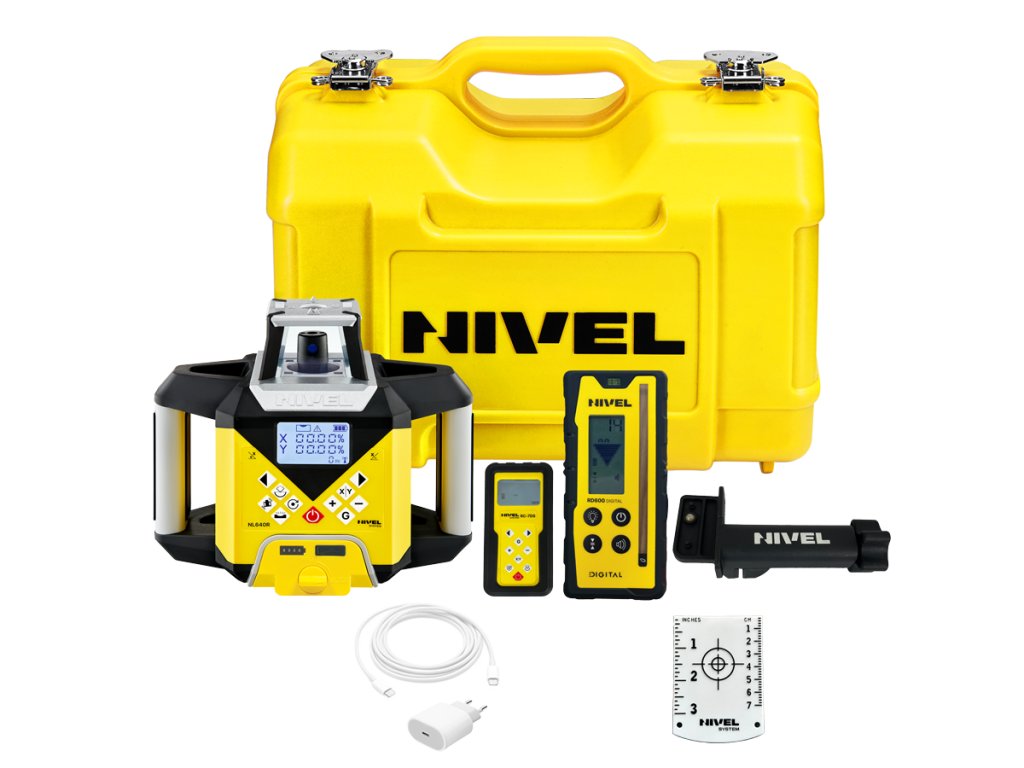 Stavebný laser Nivel System NL640R DIGITAL je presný laserový nivelačný prístroj pre horizontálne a vertikálne práce. Digitálne naklonená rovina (ovládaná z panela alebo diaľkového ovládača) umožňuje použitie pri nivelácii terénu, pokládke podláh a príprave povrchu pre dlažobné kocky, ihriská a cesty, čím zabezpečuje správne sklony. Laserová olovnica uľahčuje zarovnanie pri kolmej práci a prenos bodov. Nivel System NL640R je vybavený laserovým senzorom s dosahom až 600 m (pracovný priemer), ktorý zaisťuje presné merania aj na veľké vzdialenosti. Nastaviteľné rýchlosti otáčania hlavice (až 800 ot./min.) robia z NL640R DIGITAL vhodný prístroj pre vnútorné inštalácie aj pre ovládanie stavebných strojov. Nivel System NL640R ponúka spoľahlivosť a presnosť v každej práci.