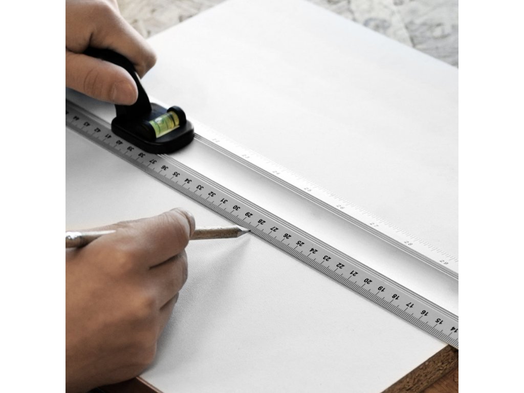 Hliníkové pravítko s libelami pre presné rezanie a značenie.